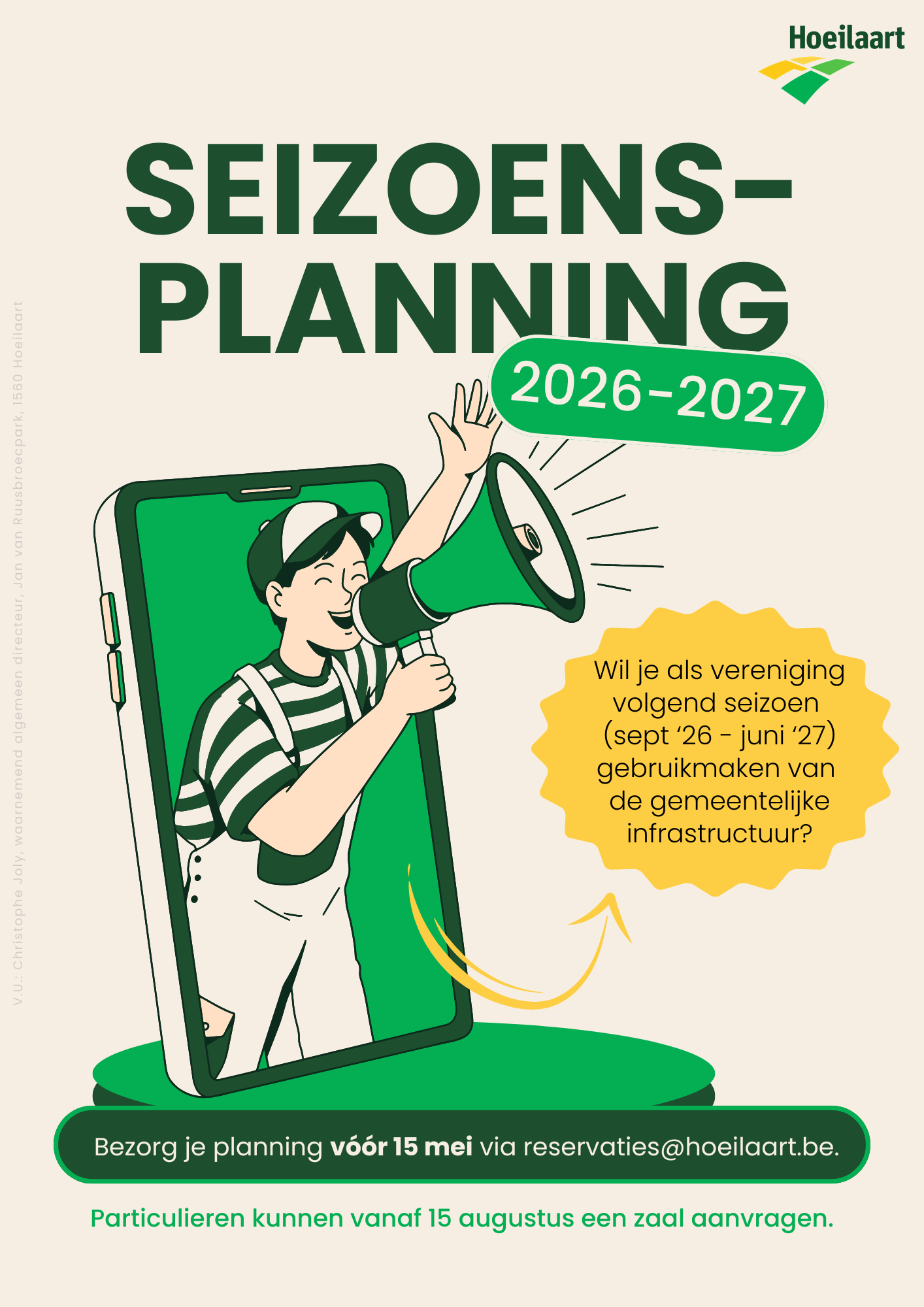 Wil je een wederkerende activiteit inplannen? Bezorg je aanvraag dan ten laatste op 15 mei via reservaties@hoeilaart.be. Voor aanvragen die tijdig worden ingediend, geldt een algemene voorrang.