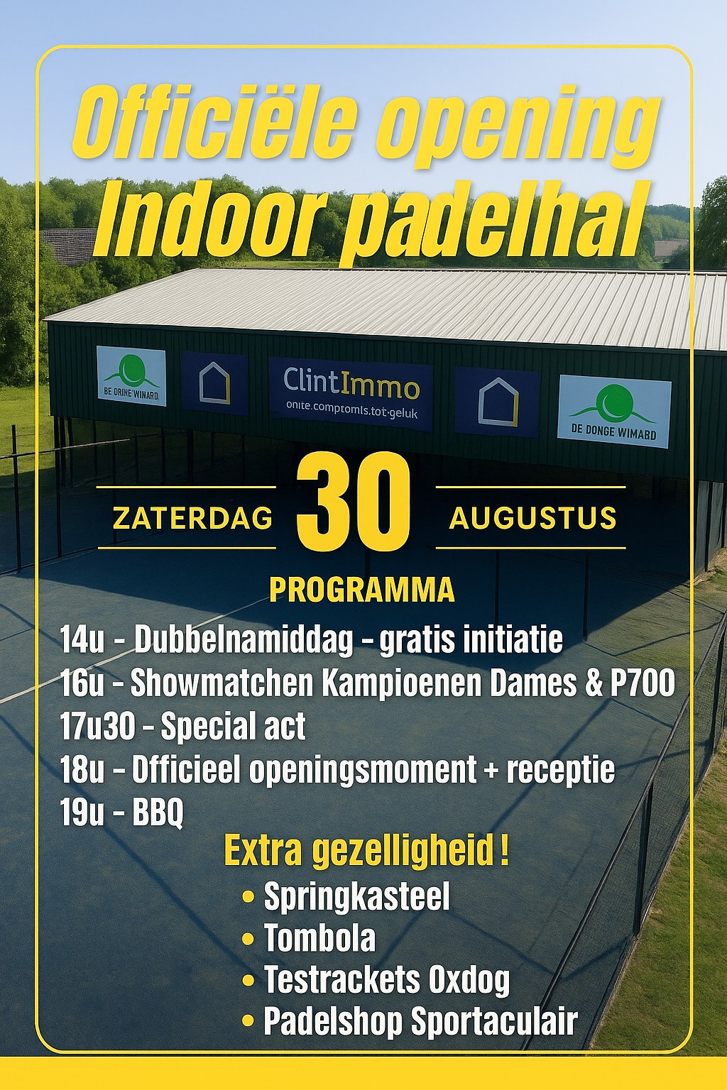 De voorbije maanden werd er hard gewerkt aan een moderne sportaccommodatie die plaats biedt aan padel op topniveau. Zowel beginnende als ervaren padelspelers zullen hier terechtkunnen in een hedendaagse infrastructuur. Noteer zaterdag 30 augustus in je agenda, want op die dag zorgen we voor een feestelijke opening van de nieuwe overdekte padelvelden.