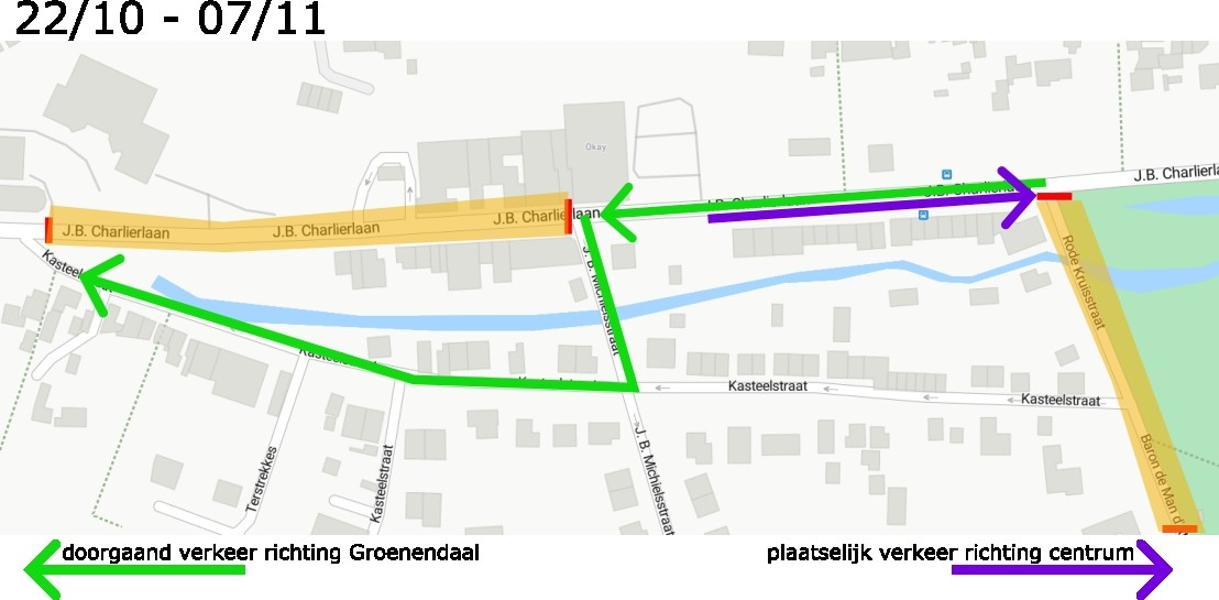 - omleiding doorgaand verkeer: richting Groenendaal via de J.B. Charlierlaan, Rode Kruisstraat, Baron de Man d'Attenrodestraat en de Vlaanderveldlaan